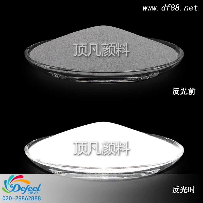 反光粉具有抗氧化程度高、耐高温、反光效果好的特点,其中分为三种折射率,即:ND≥1.90、ND≥1.93、ND≥2.2规格有200目~800目,颜色主要有银灰色及白色供选择。反光粉具有回归反光的特性并由此产生较强的回归反射效应,无需外加电源,能将85%的光线直接反射回光源处,回归反射所造成的反光亮度。