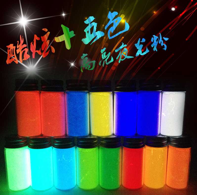 点击:夜光粉是一种用途非常广泛的颜料,服装印花、玩具注塑、涂料颜料、夜光油墨、夜光指甲油等等都可以添加夜光粉。夜光粉先吸收各种光和热,转换成光能储存,然后在黑暗中自动发光,并可无限次数循环使用。那么你知道夜光粉的颜色有多少种吗?
