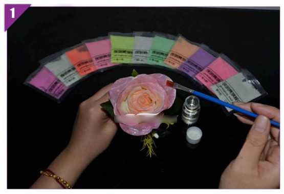 3.等光油干点后,夜光粉就牢固的沾在玫瑰花上了。好期待效果,赶快拿到客厅吸光。